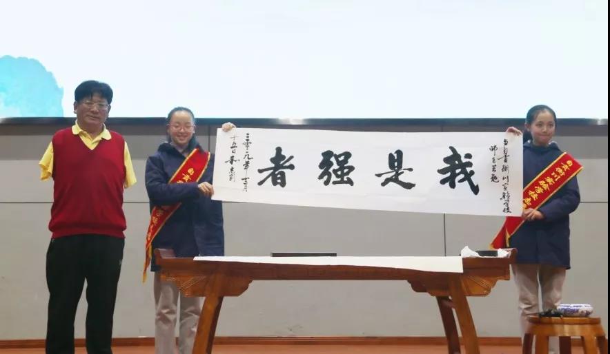隨后,和老師現(xiàn)場揮毫潑墨,獲得了師生雷鳴般的掌聲。這掌聲是為其遒勁書法,更為其勵(lì)志人生。